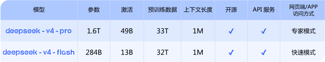 两个模型,V4-Pro 和 V4-Flash,上下文窗口直接拉到1M,参数拉到1.6T,并且是DeepSeek所有官方服务的标配(可以装一整个项目)。